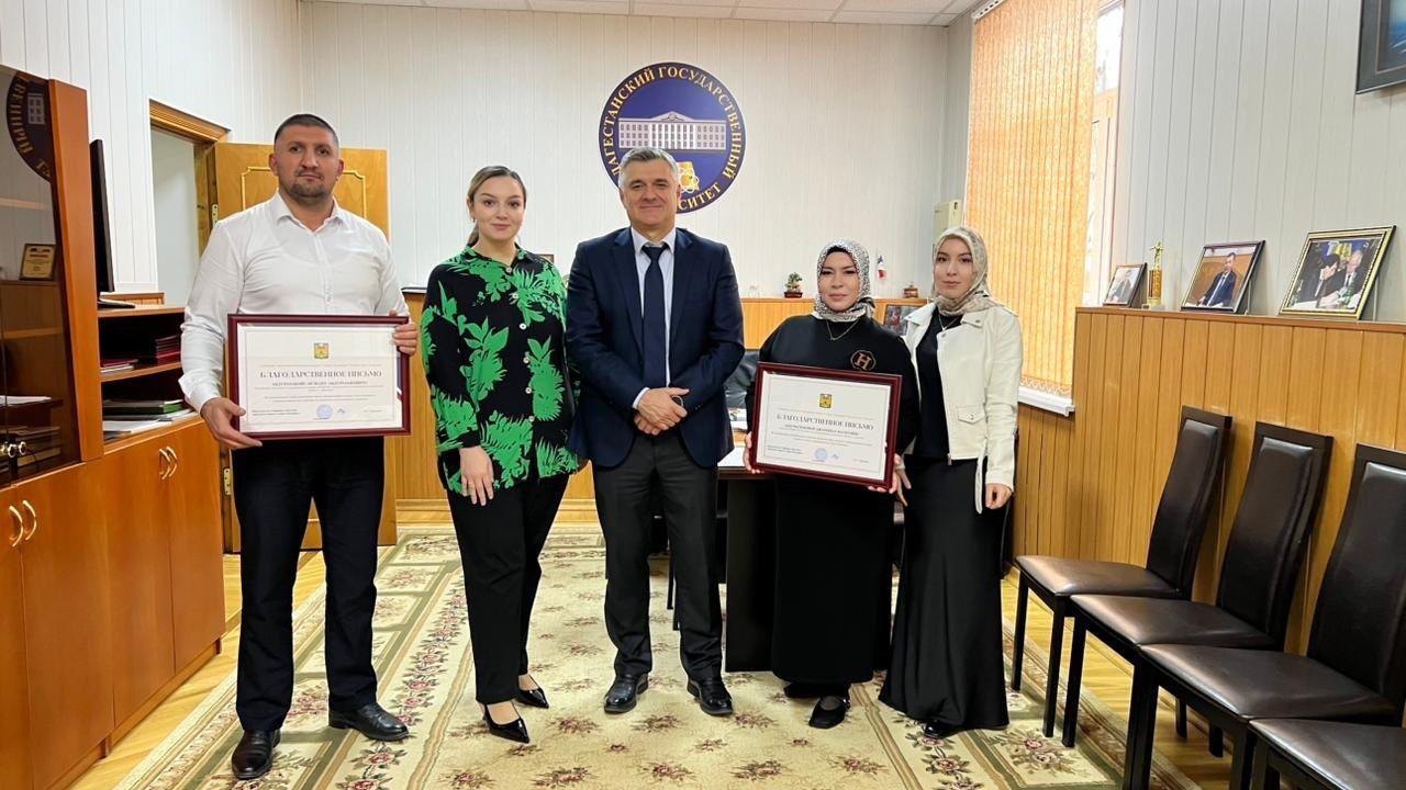 Благодарственными письмами городского Собрания депутатов за активную работу и вклад в общественную, учебную и проектную деятельность были отмечены: Осман Абдуразаков, начальник отдела по воспитательной работе филиала ДГУ и Джаминат Абдурагимова, студентка филиала.