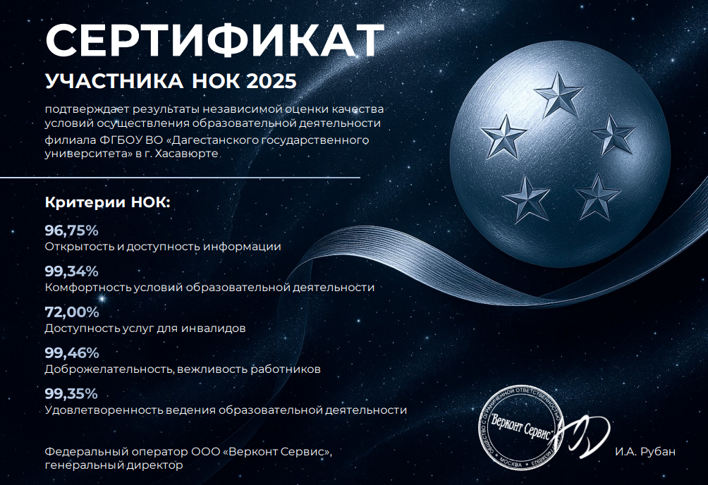 Наш вуз удостоен сертификата участника Национальной системы оценки качества (НОК) за 2025 год, что подтверждает высокое качество условий образовательной деятельности, созданных для студентов и преподавателей.