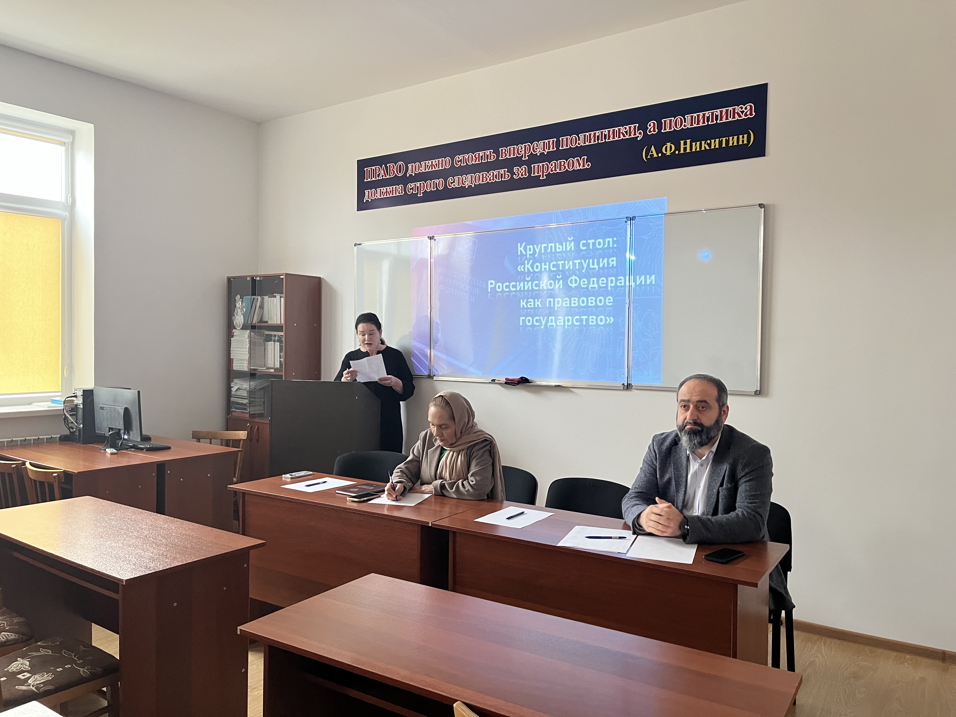Модератором мероприятия выступил доцент кафедры юридических дисциплин Гульмира Джантемирова. Заслушаны доклады: Алексей Котляров — «Конституция России спустя 32 года: итоги и перспективы»; Анар Алиев — «Проблемные аспекты реализации конституционных гарантий прав и свобод человека и гражданина РФ»; Камила Исаева — «Некоторые проблемы реализации норм Констит