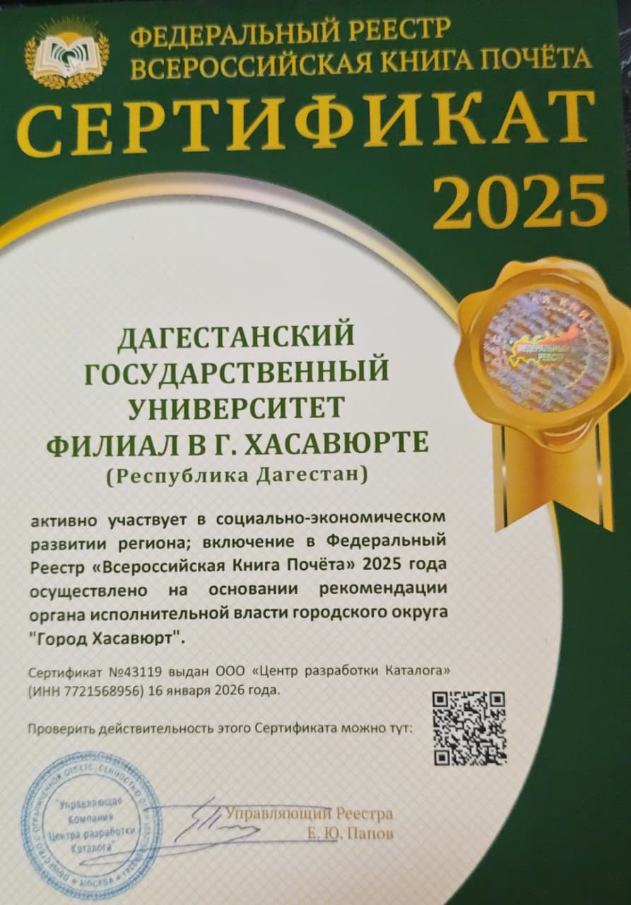 Главная » 2026 » Март » 2 » Филиал ДГУ включен в Федеральный реестр «Всероссийская Книга Почёта» 2025 года